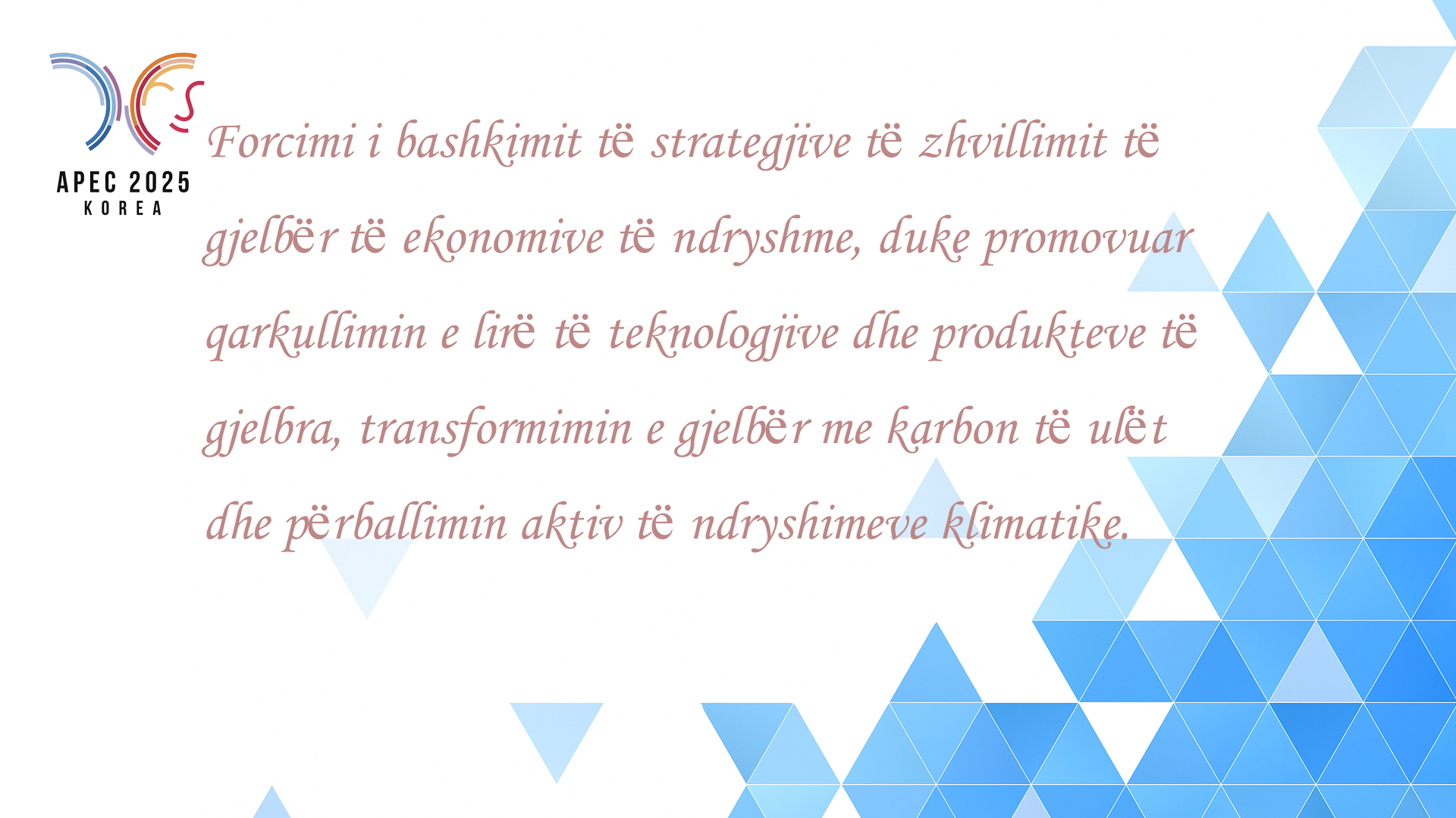 Së dyti, forcimi i bashkimit të strategjive të zhvillimit të gjelbër të ekonomive të ndryshme, duke promovuar qarkullimin e lirë të teknologjive dhe produkteve të gjelbra, transformimin e gjelbër me karbon të ulët dhe përballimin aktiv të ndryshimeve klimatike.