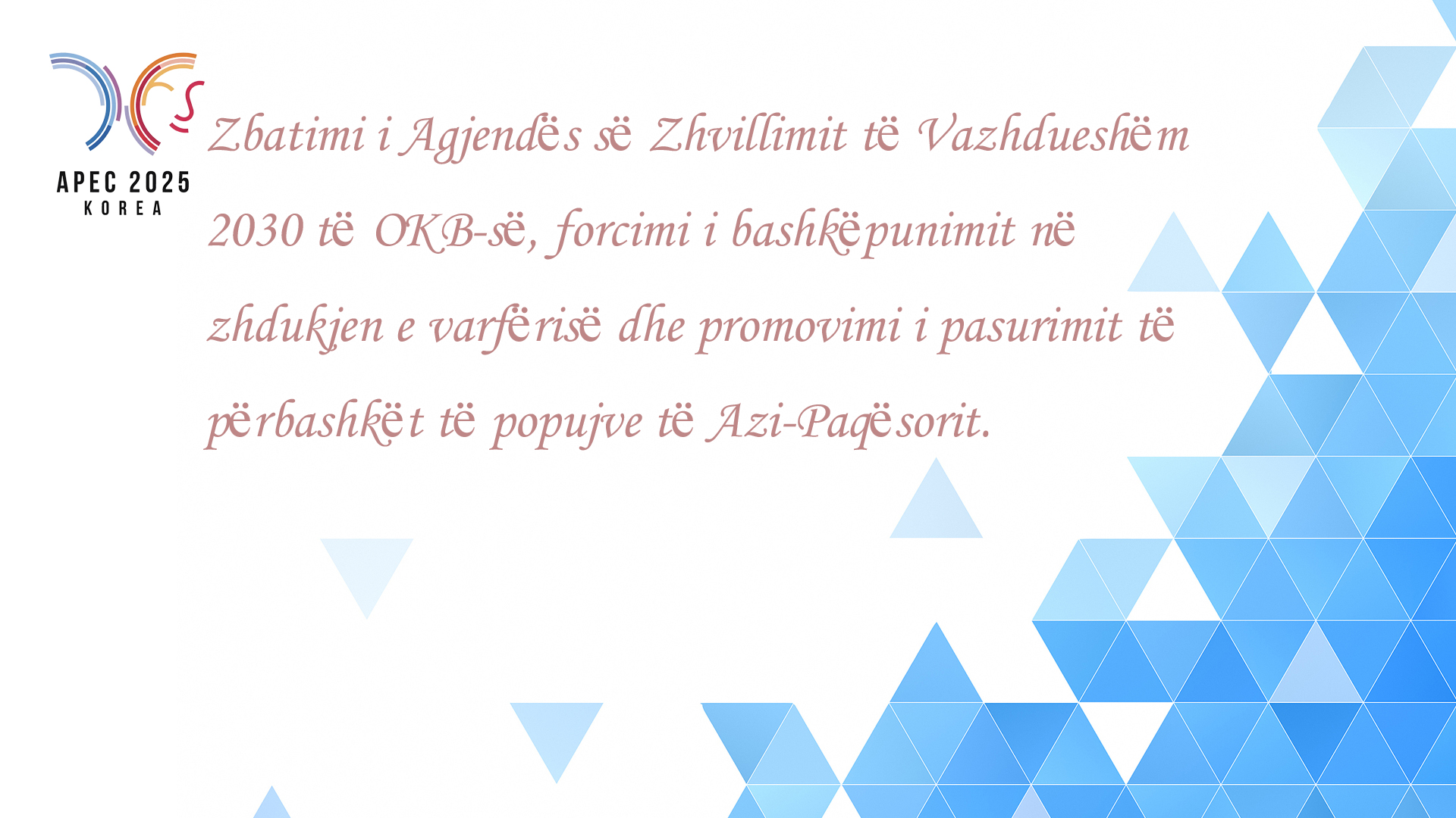 Së treti, zbatimi i Agjendës së Zhvillimit të Vazhdueshëm 2030 të OKB-së, forcimi i bashkëpunimit në zhdukjen e varfërisë dhe promovimi i pasurimit të përbashkët të popujve të Azi-Paqësorit.