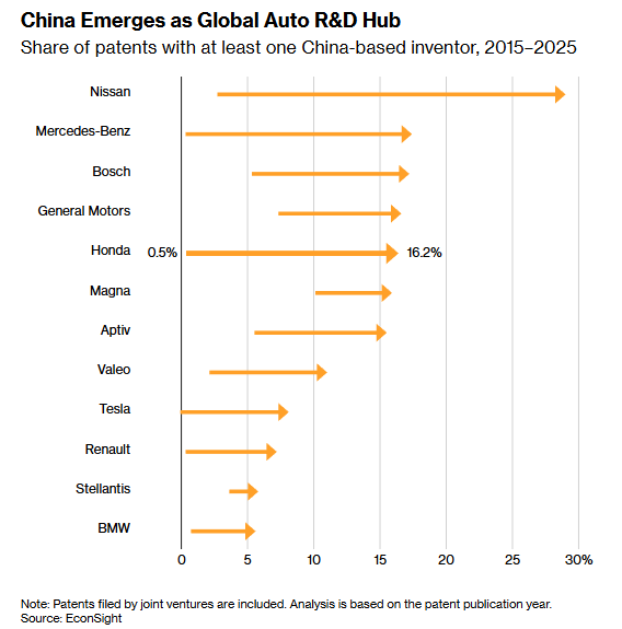 Sipas analizës së artikullit, pjesëmarrja e Kinës në kërkim-zhvillimin global të automjeteve vazhdon të rritet dhe Kina është bërë një qendër e rëndësishme kërkimi dhe zhvillimi. Gjigantët evropianë të automjeteve detyrohen të zgjedhin midis qëndrimit në një model biznesi në rënie ose bashkëpunimit me teknologjinë kineze.
