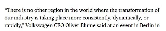 Artikulli përfundon duke cituar fjalët e kryeekzekutivit të “Volkswagen”-it Oliver Blume: “Asnjë vend në botë nuk mund të promovojë transformimin e industrisë së automjeteve në mënyrë më të qëndrueshme, më dinamike dhe më të shpejtë se Kina. ”